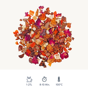 Backbirne vereint Apfel- und Birnenstücke als fruchtige Grundlage, Karamellstücke geben der Mischung eine feine Süße. Zimt bringt würzige Akzente, die an Gebäck erinnern, während Rosenblütenblätter eine elegante Note hinzufügen. Karottenstücke und Mönchsfrucht runden die Süße auf natürliche Weise ab.