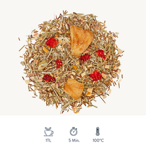 Die fruchtige Süße von Ananas verbindet sich mit der mediterranen Würze des Rosmarins zu einer spannenden Mischung. Lemongras fügt eine zitronige Leichtigkeit hinzu, Erdbeerstücke bringen dezente Fruchtnoten. Kurkuma sorgt für den warmen Farbton des Aufgusses, während Rooibos eine milde Basis liefert.