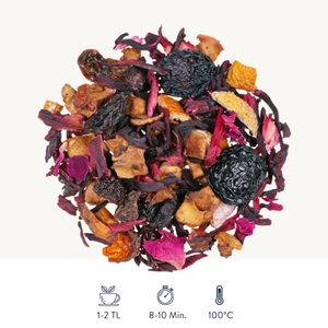 Die sorgfältig ausgewählten Zutaten wie Hibiskusblüten, Apfelstücke, Weinbeeren, Hagebutten und Kirschen entfalten beim Ziehen ein unverwechselbares Aroma, das die kalte Jahreszeit einfach schöner macht. Die zusätzlichen Orangenschalen und Rosenblütenblätter verleihen dem Tee eine edle Note und rundet den Geschmack harmonisch ab. 🍊🌹