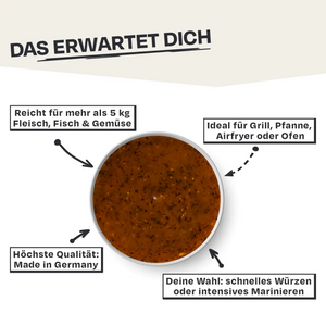 Anwendung der Trüffelmarinade: Wir empfehlen dir pro 1kg Grillgut 90 – 120g Marinade zu verwenden. Lasse die Marinade dabei am Besten für mindestens 6, besser für 12 Stunden im Kühlschrank einziehen, sodass sich ihr Geschmack optimal verteilen kann.