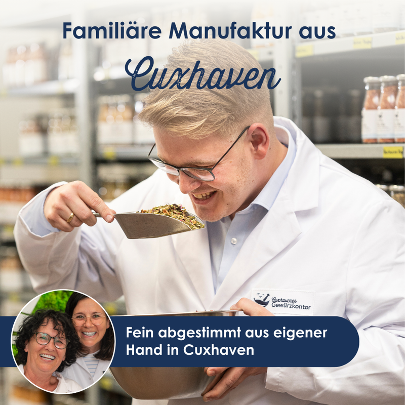 Aus Überzeugung ohne Geschmacksverstärker oder anderen Schietkram, aber natürlich mit Herz! Wir verarbeiten vorwiegend Zutaten aus kontrolliert biologischem Anbau. Aroma-Magie verträgt keine Chemie! Selbstverständlich kommen unsere Gewürzmischungen ohne Farbstoffe, Konservierungsstoffe, Rieselhilfen und Geschmacksverstärker aus.