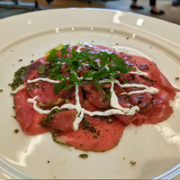 Rindercarpaccio dünn auf Tellern anrichten, mit etwas Olivenöl beträufeln und zum Abschluss mit Lava-Salz bestreuen.