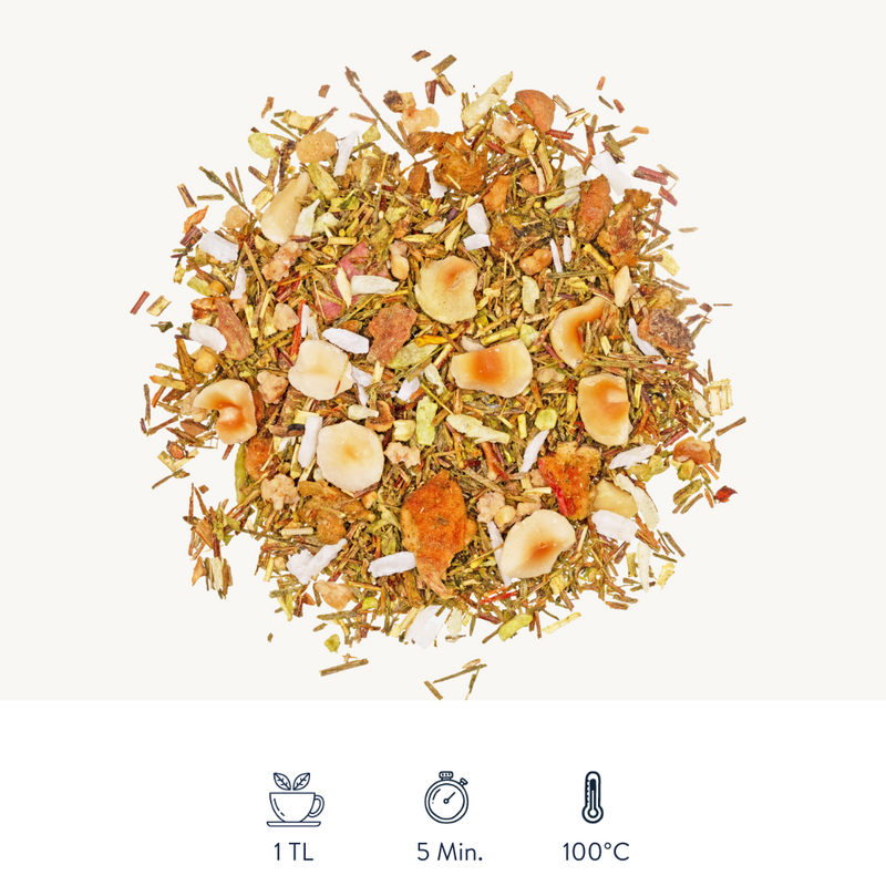 Matcha Haselnuss ist ein Tee für alle, die Abwechslung lieben. Grüner Rooibos bildet die sanfte Basis, während feiner Matcha Frische hineinbringt. Geröstete Haselnüsse und knusprige Krokantstücke sorgen für eine angenehm süße Nussigkeit. Kokosraspeln und Apfelstücke machen den Geschmack voll und harmonisch. Honeybush und Zimt setzen feine Akzente, die sich perfekt mit der Haselnuss verbinden.