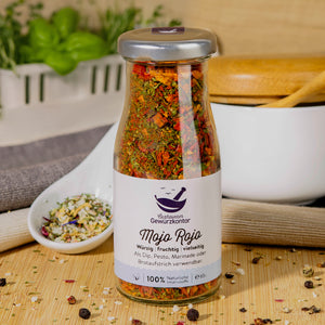Vielseitig einsetzbare Mischung nach kanarischer Art. Als Dip, Pesto, Marinade oder Brotaufstrich verwendbar. Zubereitung: 3 Teelöffel Gewürz mit 1 Esslöffel heißem Wasser verrühren, 1 Esslöffel Olivenöl und 1 Teelöffel Balsamico Bianco hinzufügen und 10 min. ziehen lassen. Nach Geschmack mit frischem Gemüse verfeinern.