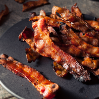 Speckscheiben mit Paprikapulver bestäuben und im Ofen knusprig backen.