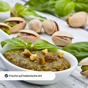 Schon beim ersten Löffel zeigt sich der besondere Charakter: die zarte Süße und der leichte Biss der Pistazien verbinden sich mit der belebenden Frische der Minze. Heraus entsteht ein Pesto, das intensiv und erfrischend zugleich wirkt – perfekt für alle, die mediterrane Küche einmal neu erleben möchten.