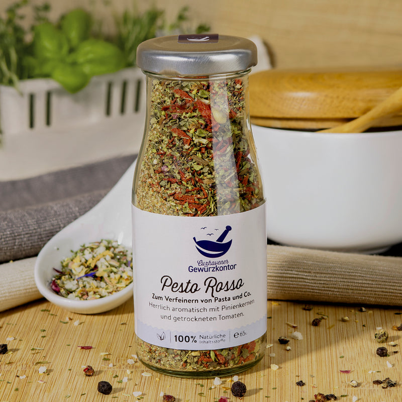 Wir lieben Pasta! Und den Duft der richtigen Gewürzmischung, die uns subito nach Italien versetzt. Bei unserem Pasta Gewürz Pesto Rosso ist es der Geschmack nach sonnengereiften Tomaten und Pinienkernen, dazu etwas Basilikum, Knoblauch sowie Oregano und Thymian. Viel mehr braucht es nicht, um ein gutes Pastagericht auf den Tisch zu stellen. Du rührst das Pastagewürz mit etwas Wasser und Olivenöl an, und hebst es unter die frische Pasta. Dazu ein gutes Olivenöl und etwas frisches Basilikum, ein wenig Parmesan und fertig!