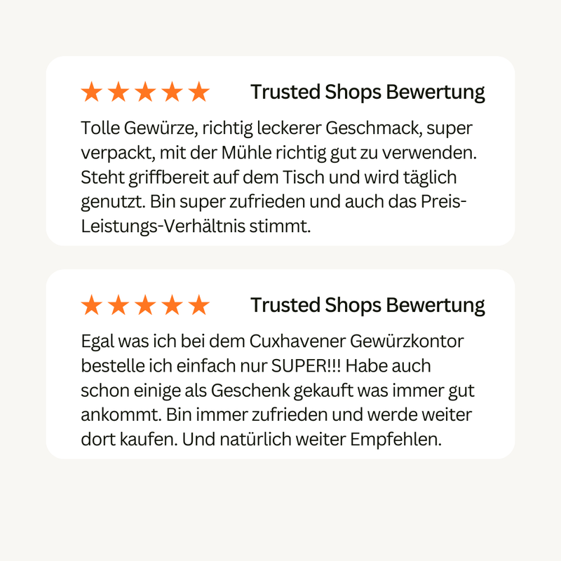 Aus Überzeugung ohne Geschmacksverstärker oder anderen Schietkram, aber natürlich mit Herz! Wir verarbeiten vorwiegend Zutaten aus kontrolliert biologischem Anbau. Aroma-Magie verträgt keine Chemie! Selbstverständlich kommen unsere Gewürzmischungen ohne Farbstoffe, Konservierungsstoffe, Rieselhilfen und Geschmacksverstärker aus.