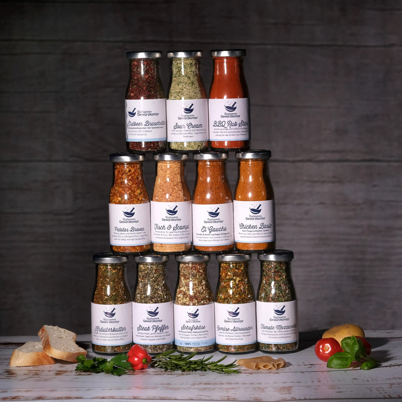 Für aromatische Dips befinden sich das Erdbeer Bruschetta Gewürz und die Sour Cream Gewürzmischung in unserem Grill Bestseller Set. Salatliebhaber kommen mit dem Tomate-Mozzarella Gewürz und dem Salat Würzer voll auf ihre Kosten.