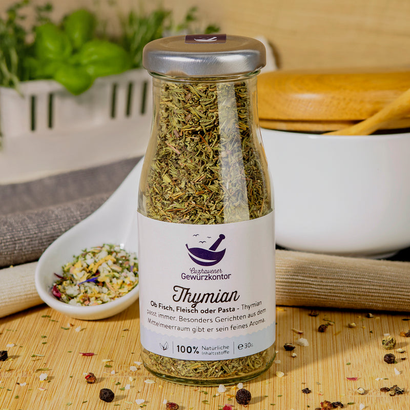 Thymian harmoniert besonders gut mit Tomaten, Knoblauch und Olivenöl und entfaltet so den typischen Mittelmeer-Geschmack. Er passt perfekt in Kräuter- und Bratensaucen, rundet deftige Suppen ab und macht Fleischgerichte noch aromatischer.