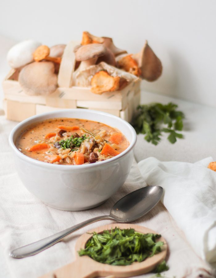 Reis mit Brühe und etwas Weißwein garen, zum Schluss Meeresfrüchte und die Umami Steinpilz Mischung unterrühren.