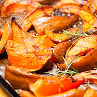 Kürbisspalten mit Öl und der Currymischung würzen und rösten.